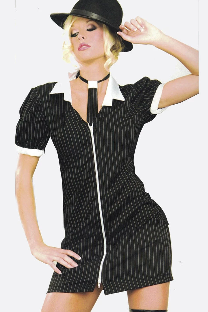 This Gangster Gal costume includes a black and white striped mini dress with a zip up front and matching tie. (Hat not included.)
