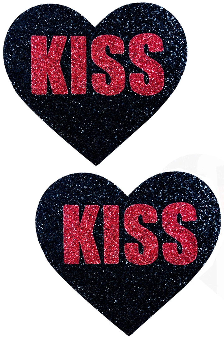 Perfect for your Valentine, these Kiss Black Glitter Heart Nipple Pasties feature latex-free medical grade adhesive and completely waterproof! Just peel and stick on clean dry skin. Lasts up to 10-12 hours. These glitter nipple pasties feature black glitter hearts with KISS in glitter red lettering.