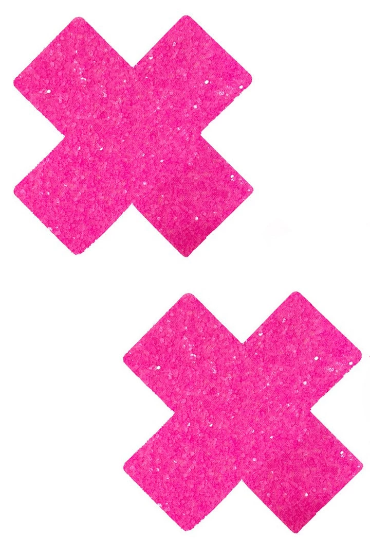 Super Sparkle Pink Chunky Glitter XX Nipple Pasties that feature latex-free medical grade adhesive and completely waterproof! Just peel and stick on clean dry skin. Lasts up to 10-12 hours.