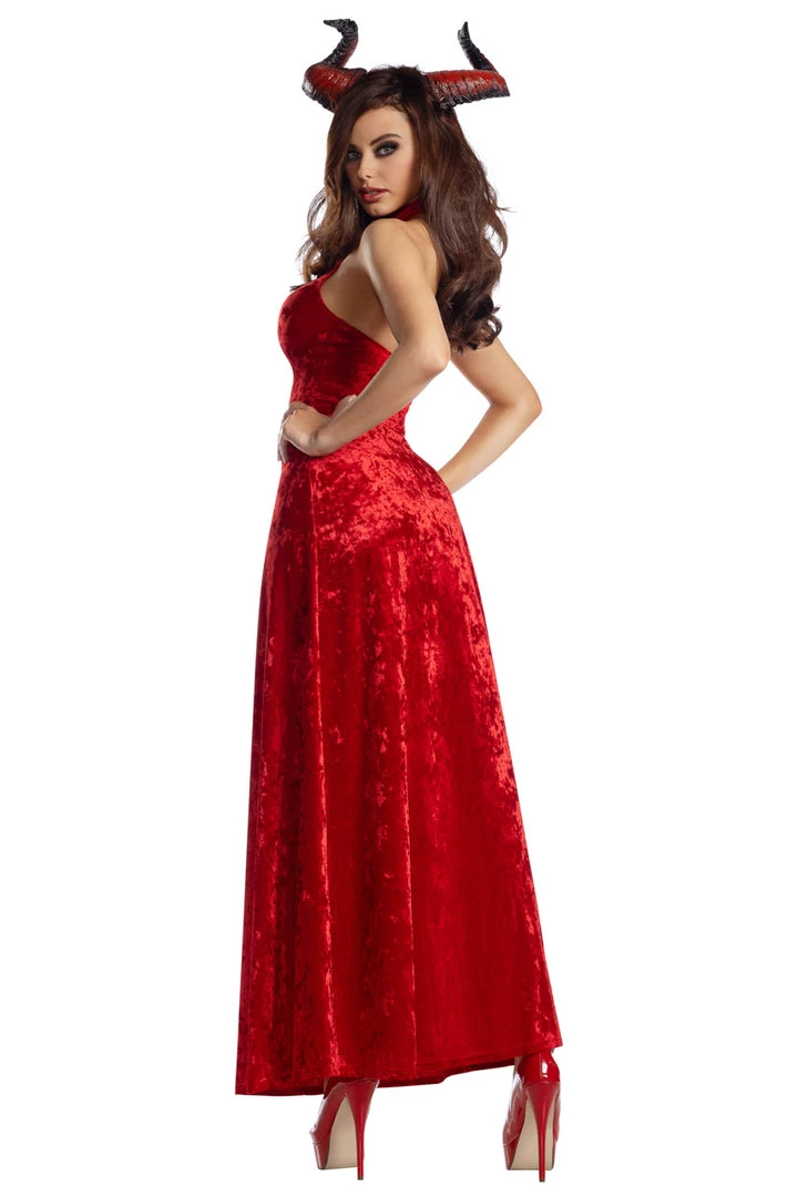 This Bad Religion Demon costume includes a long red velvet dress with a high side slit, built-in panty, and upside down mesh cross detail, and matching horns. (Staff not included.)
