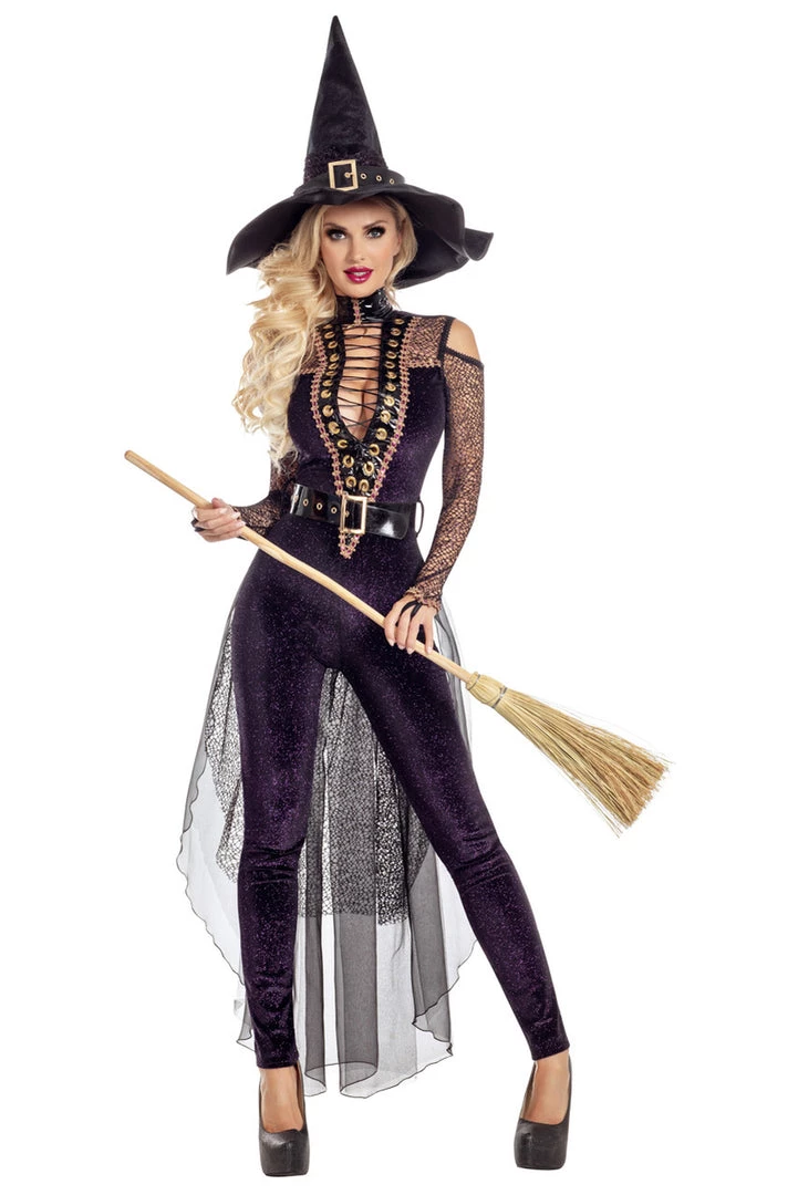 Turn some heads in this Midnight Violet Witch costume featuring a violet velvet catsuit with glitter detail, mesh sleeves with cold shoulder cut outs, a low V cut bodice with black lace-up detail, multiple grommets, metallic mesh accents, a black mesh bustle back, black belt and matching hat. (Broom not included.)
