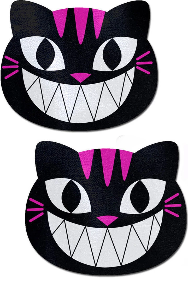 Give a mischievous grin in these Black & Pink Cheshire Cat Nipple Pasties that features a pair of black and pink Cheshire cat nipple covers with hypoallergenic pasties materials. Includes medical-grade adhesive, just peel-and-stick on clean, dry, oil-free skin.