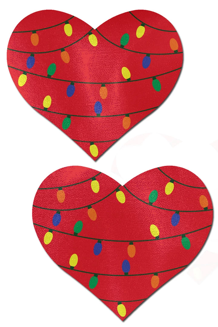Jingle those bells with these Christmas Lights Heart Nipple Pasties that feature form fitting material that forms to curves and resists wrinkling over hardening nipples. Just peel-and-stick on clean, dry skin.