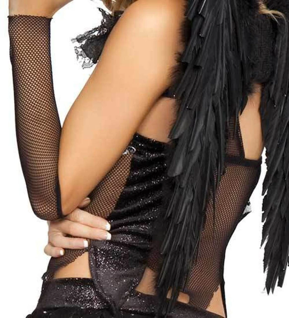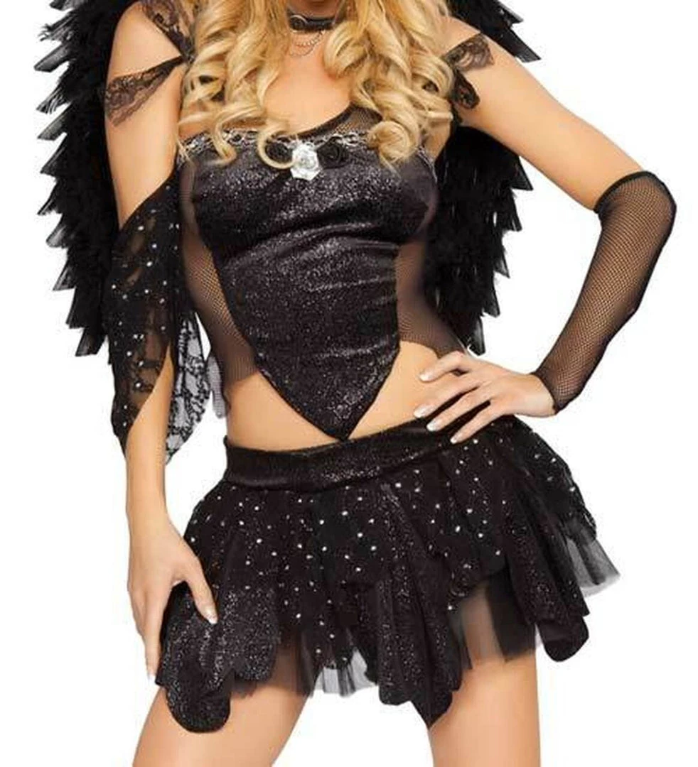 Discover your darkness with this Twilight Raven Black Angel Costume. Show off your curves while leaving some of the mystery to the bedroom with a unique tapered fishnet and fabric top. A short skirt with a tattered hem adds to the sultry appeal, and rounding out the costume is a black and white rose Appliqué that screams Gothic. For an extra dimension to the outfit add one of our chokers or black angel wings.