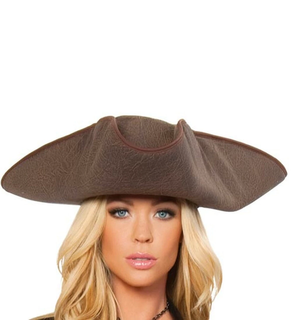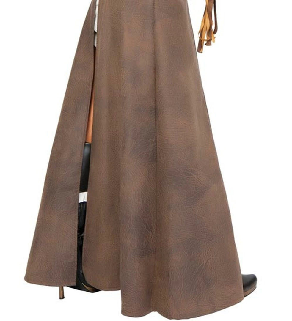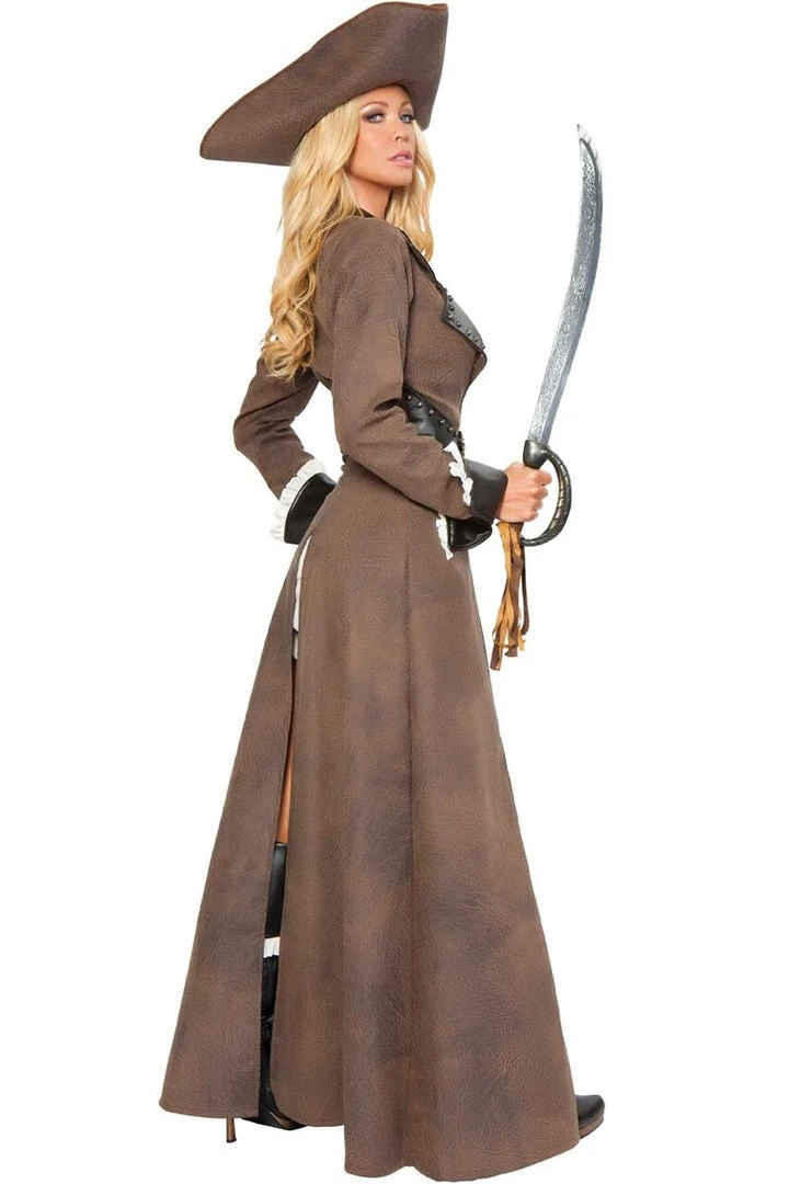 This deluxe, five-piece Pirate Captain costume includes a gauze mini dress with a strapless silhouette, a brown trench coat jacket with stud details and an attached rhinestone belt, a matching hat, and sword.