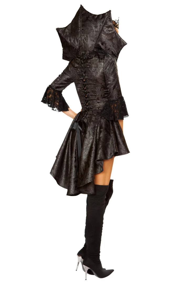 They’re sure to bow down to you in this four-piece Queen of Darkness costume featuring a dress with a built in corset, a high/low hemline, a structured bustline, mini shorts, a removable collar and a crown.