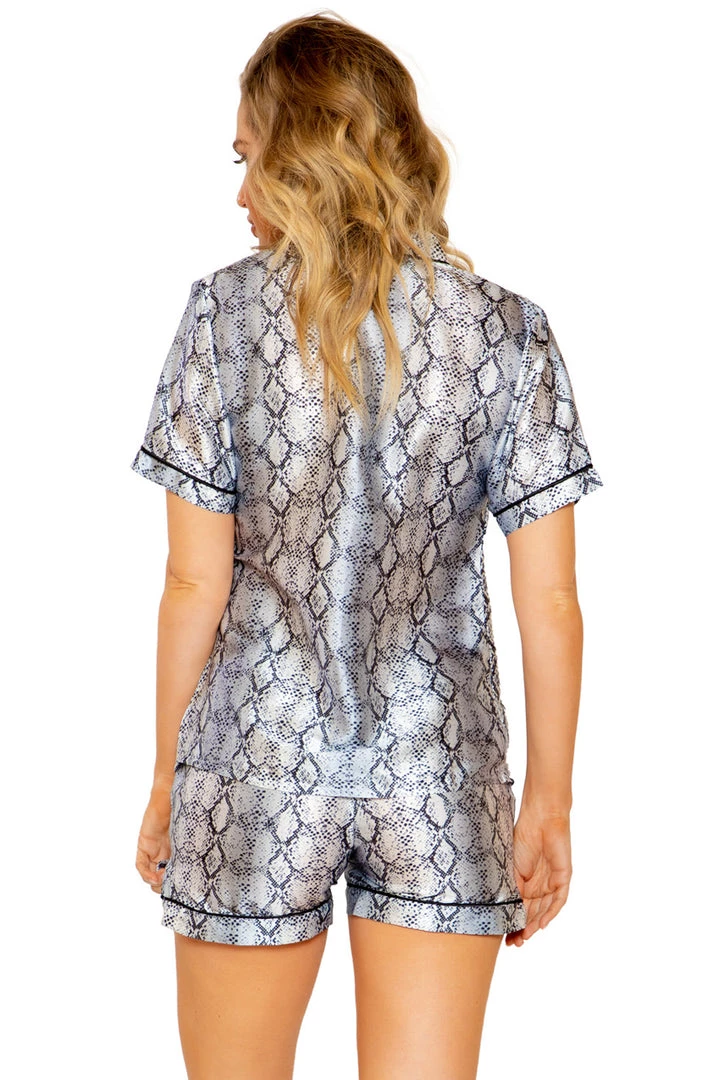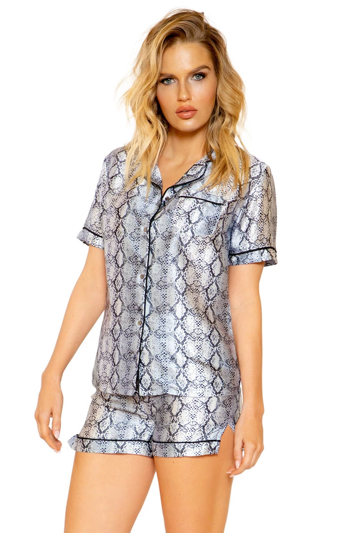 These satin, snakeskin print pajamas features a button up shirt with short sleeves and matching shorts.