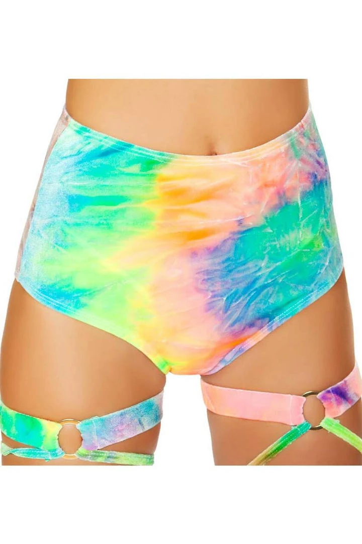 Flaunt your festival cheer wearing these cute tie dye high waisted lingerie shorts from Roma Costume. These sexy shorts feature a nice full covered front with a cheeky cut back to beautifully show off your derriere. The super-soft, multi-colored fabric feels great against your skin and stretches to conform to your shape.