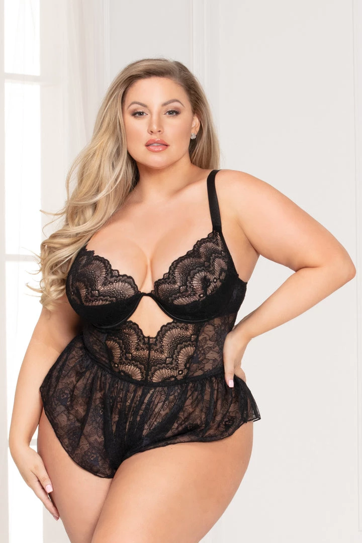 This plus size, flirty black floral lace teddy features a skirted flounce bottom, a cheecky cut back, underwire cups, ahook and eye back closure and keyhole cut outs.
