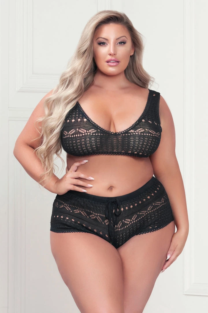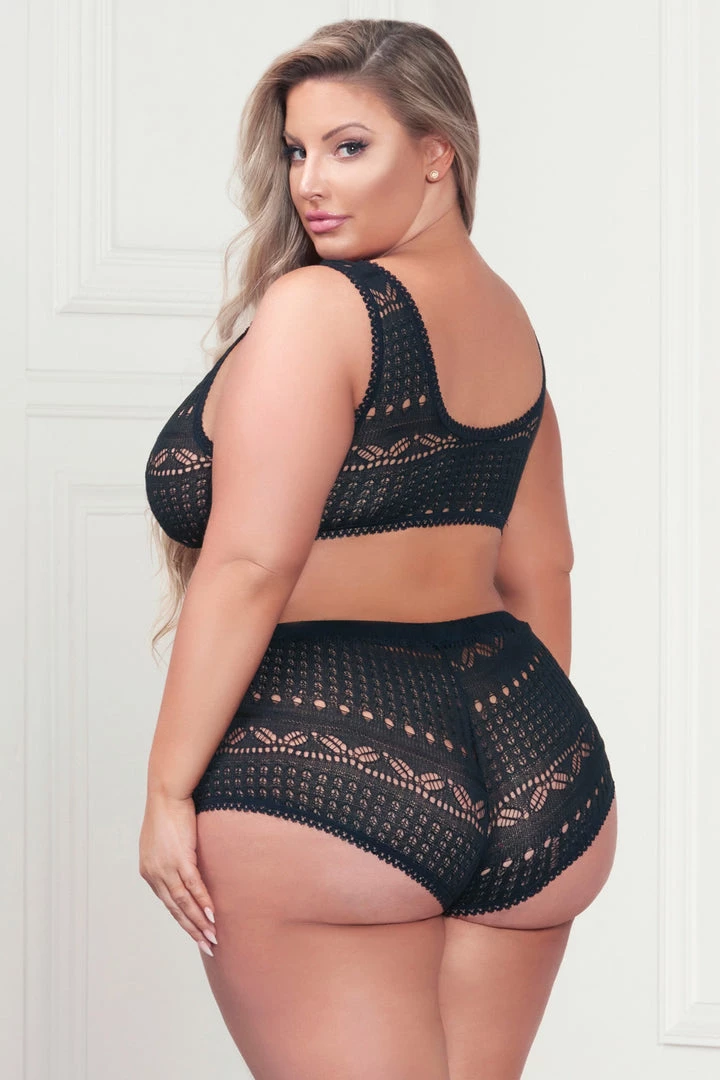 This plus size, Cuddle Close bra set includes a sweater patterned bralette with a scoop neck, thick straps, and matching boyshorts.