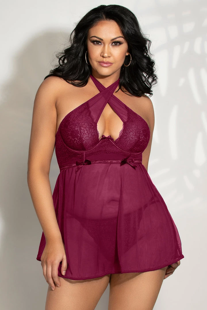 This plus size, drama queen babydoll features a mesh skirted bottom, lace bust with a criss cross neckline, keyhole cut out, underwire cups, satin bow appliques, adjustable straps, a flutter open back, and a matching thong.