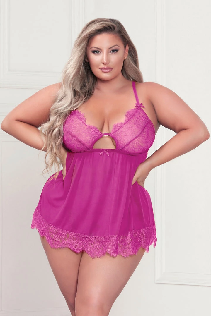 This two-piece, plus size eyelash lace and mesh babydoll features a keyhole cut out front, rhinestone charm detail, satin ribbon bows, adjustable straps, gold hardware, flyaway back, and a matching panty with back keyhole detail.