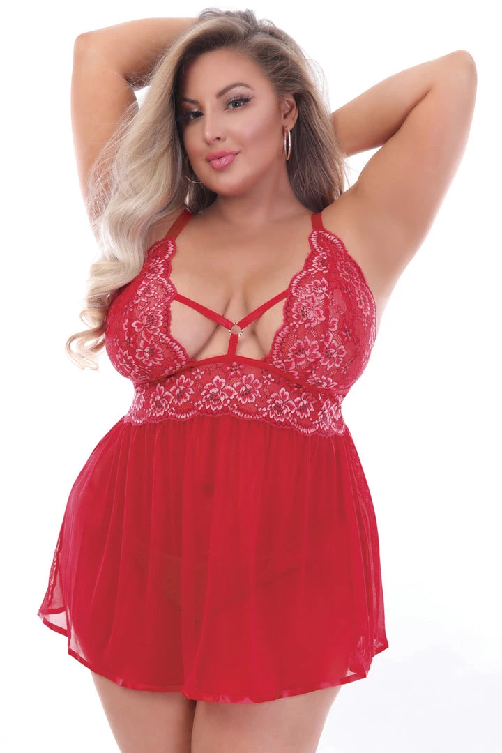 This two-piece, plus size passion babydoll features cross-dye lace, a mesh skirted bottom, a strappy front with rhinestone O-ring detail, a hook and eye back, gold hardware, adjustable straps, satin ribbon trim, and a matchng g-string with strappy back detail.