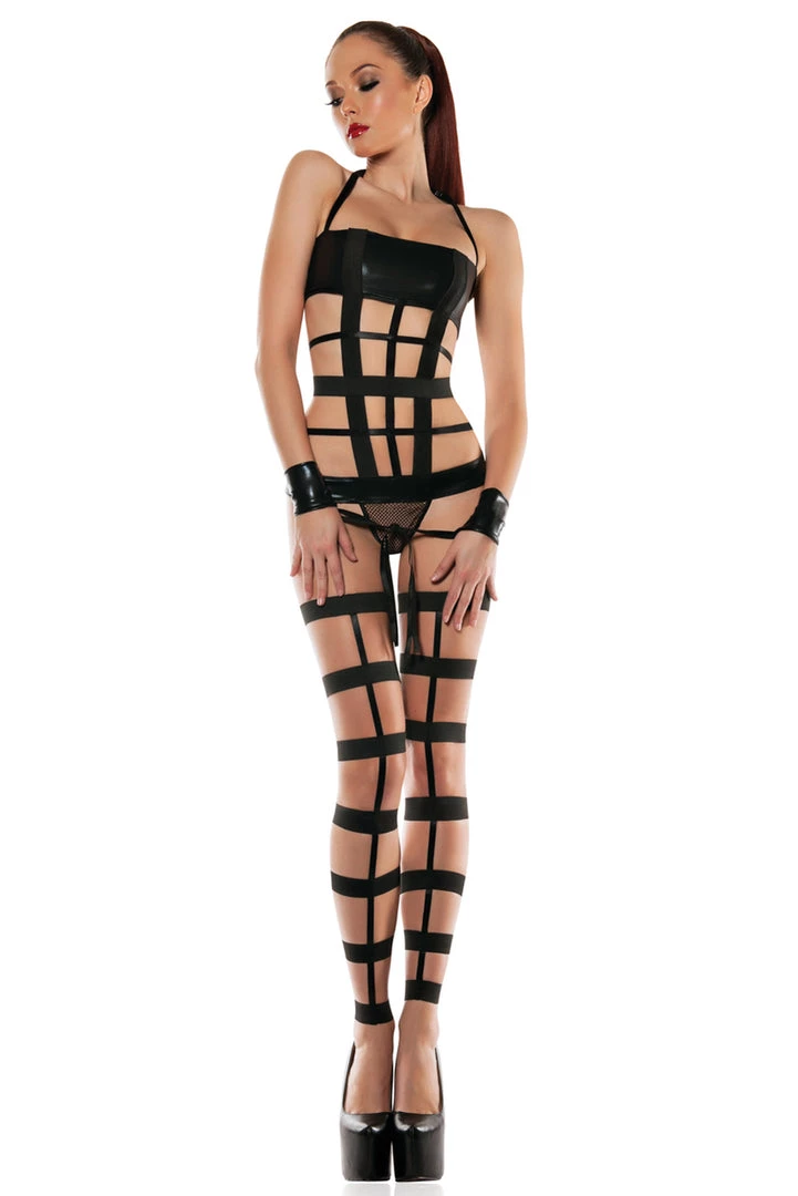 This strapped down set includes a strappy, bandage-style teddy with elastic strap leg pieces and wrist cuffs with ties.