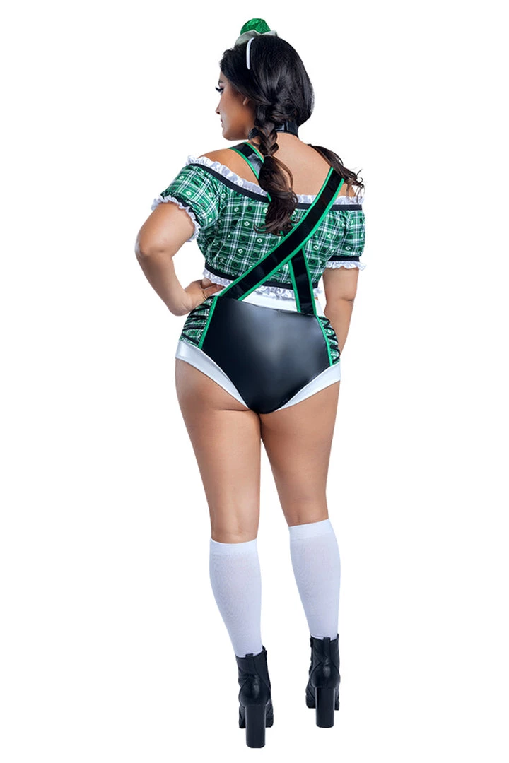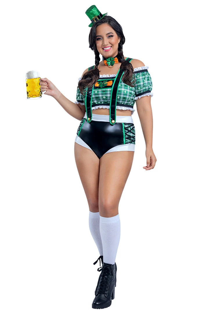This plus size Lucky Charm costume includes a printed four leaf clover ruffled crop top, wet look shorts with criss cross sides, a hat, and choker. (Stockings not included.)