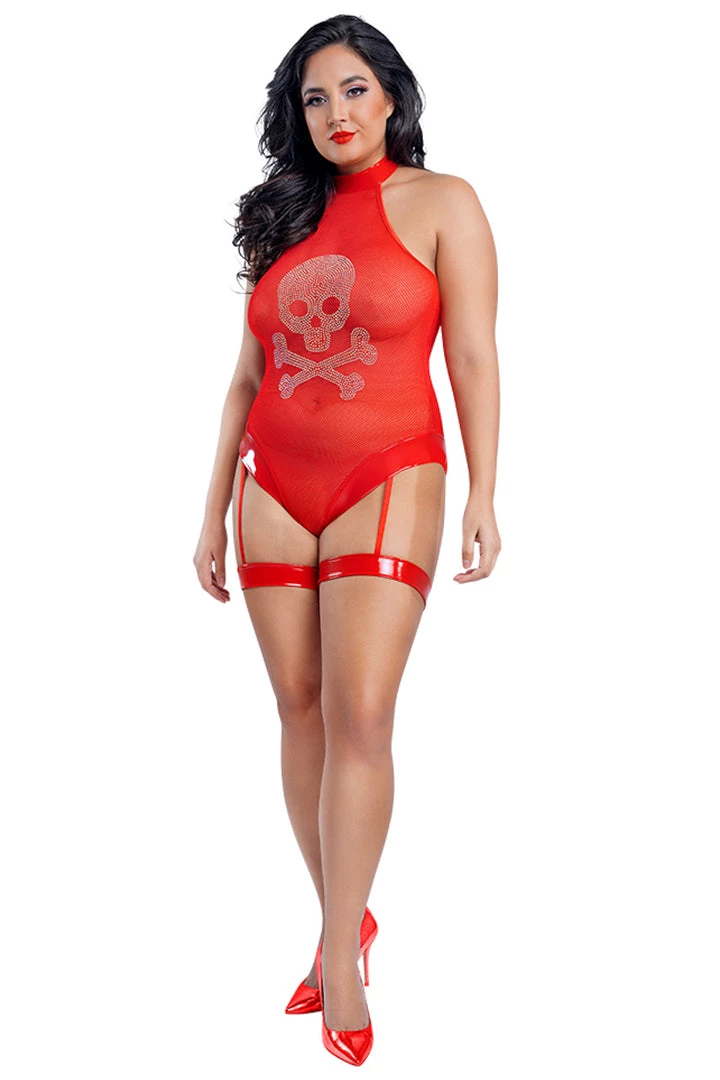 This plus size Red Skull Hottie costume includes a red mesh teddy with a high cut halter neck, rhinestone skull front, vinyl trim, attached garters with removable leg straps, and a thong back.