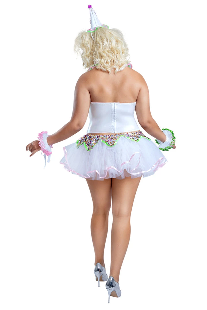 This plus size Vintage Clown costume includes an iridescent spandex top with jewel details, a halter neck, a tulle ruffle collar, a matching skirted panty, ruffled wrist cuffs, and a matching clown hat.