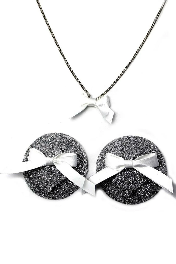 Here’s an idea for a super-sexy Valentine’s Day neither of you will be able to forget — wear this Sweetheart Sweet Set.. and nothing else! These sparkly round nipple covers are lovingly handcrafted with little hearts and bows. Pair it with the matching necklace to pull off a look that will drive him wild. We carry them in pink/black, silver/pink and black/white.